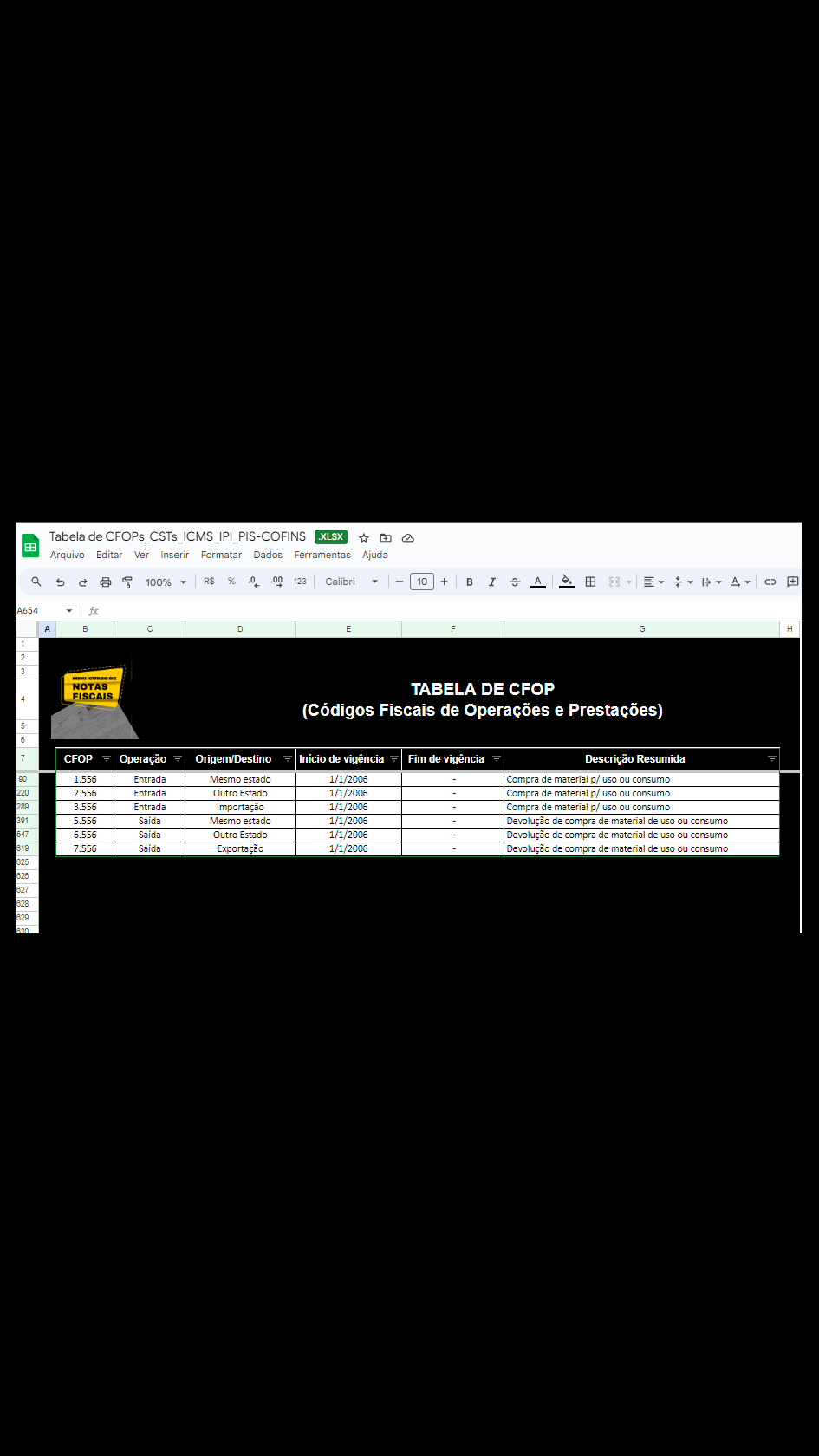 Material Extra 5 - Tabela CFOPs, CSTs, ICMS, IPI, PIS-COFINS.
